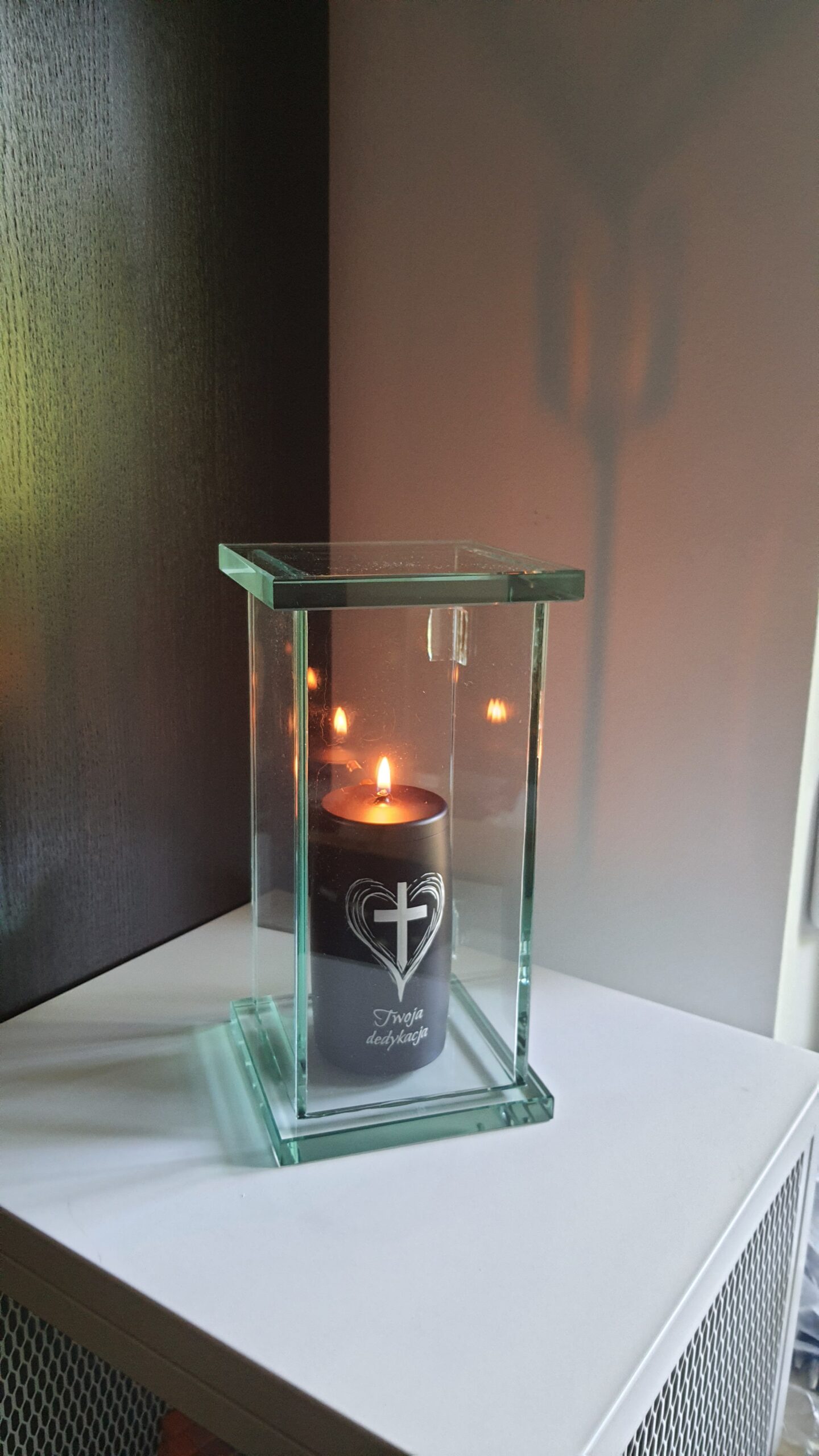 Refillable Memorial Candle ETERNA LUMINA, matt black, laser engraving: heart/cross