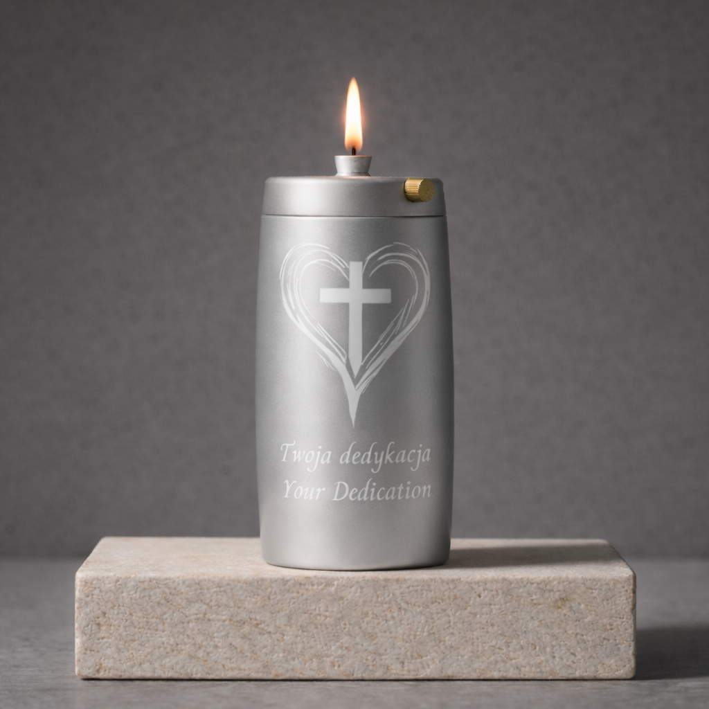 1 review for Refillable Memorial Candle ETERNA LUMINA, matt silver, laser engraving: heart/cross + dedication
